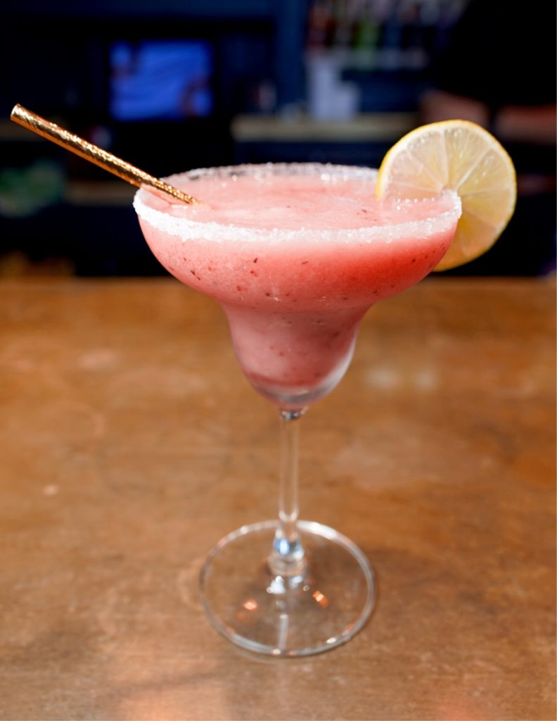 A sweet and tasty strawberry daiquiri cocktail infused with white rum, strawberry liqueur, strawberry puree, lemon juice, and vanilla syrup.
